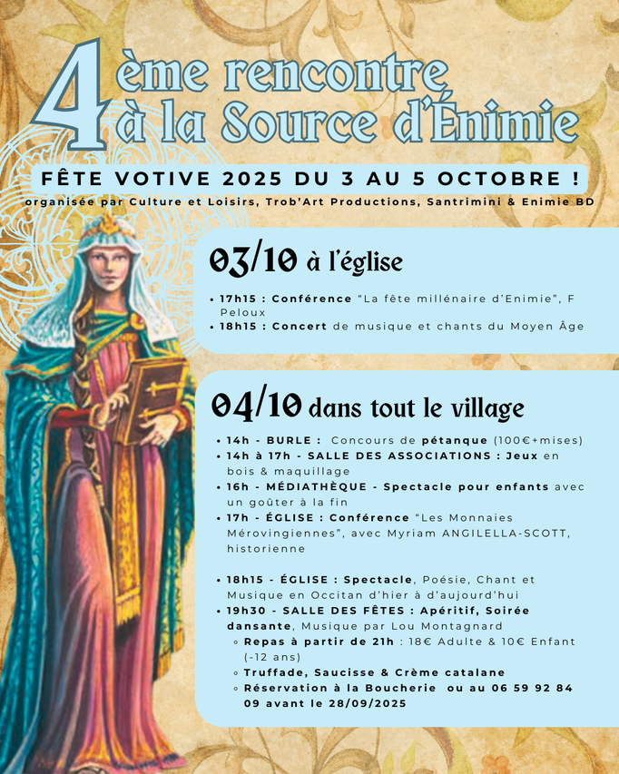 En 2025, c’est toujours le premier week-end d’octobre qu’ENIMIE BD s’inclut dans la Fête votive pour inscrire ses 4èmes Rencontres À LA SOURCE D’ENIMIE dans les pas millénaires du manuscrit du troubadour Bertran de Marselha. Plusieurs rendez-vous sont proposés à tous tout au long des 3 jours, du 3 au 5 octobre.