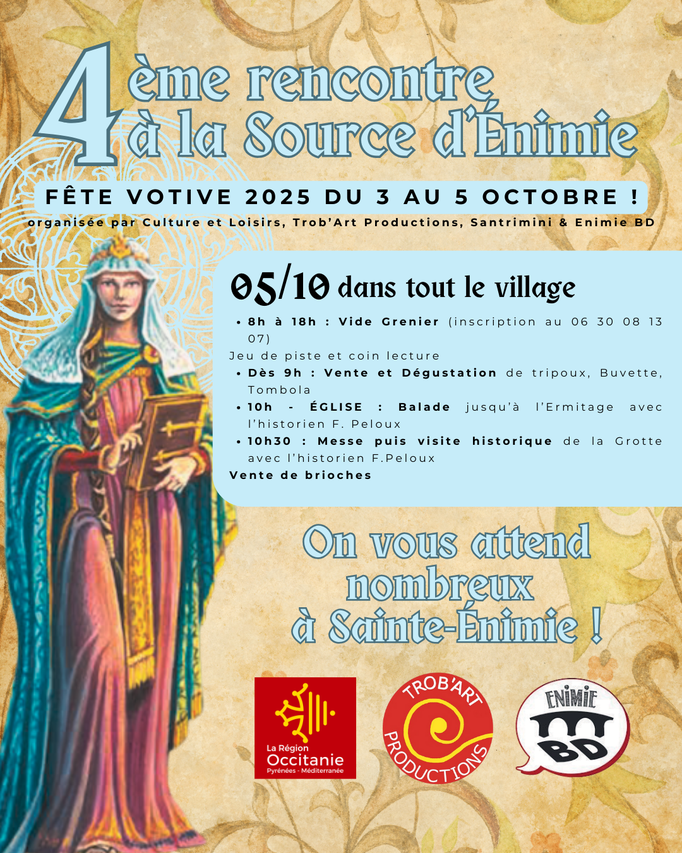 Dimanche matin, 5 octobre, vide-grenier et vente de manouls en bas du village par l’association Culture et loisirs. Mais c’est le jour du pèlerinage millénaire d’ENIMIE ; aussi, dès 10 h 30, rendez-vous devant l’église pour une balade historique guidée par Fernand PELOUX, spécialiste français des hagiographies, qui permettra aux participants de s’élever vers l’ermitage où les attendront le curé de la paroisse et nombre de Santrimiols regroupés pour la messe annuelle, suivie d’un pot partagé et de la vente traditionnelle de fouaces par l’association Santrimini.